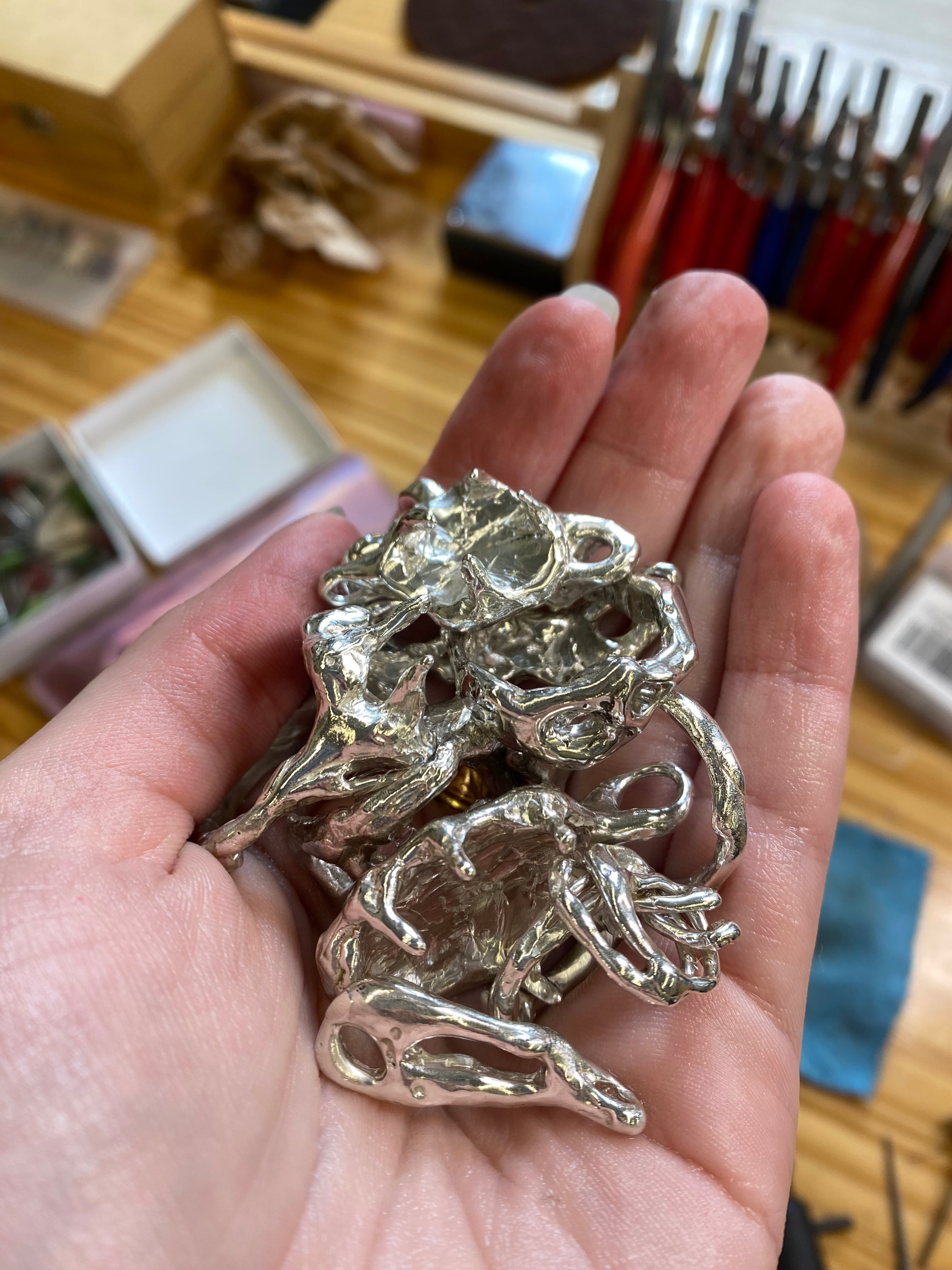 Founded in 2025 by designer and maker Ava Wood, And What? Studio is an independent jewelry brand rooted in organic, sculptural forms and bespoke elegance. Each piece is handcrafted by Ava in Providence, Rhode Island using the lost wax casting method. Every design begins in wax and is transformed into sterling silver or gold—resulting in one-of-a-kind pieces, each infused with intention and the distinctive charm of And What? Studio.